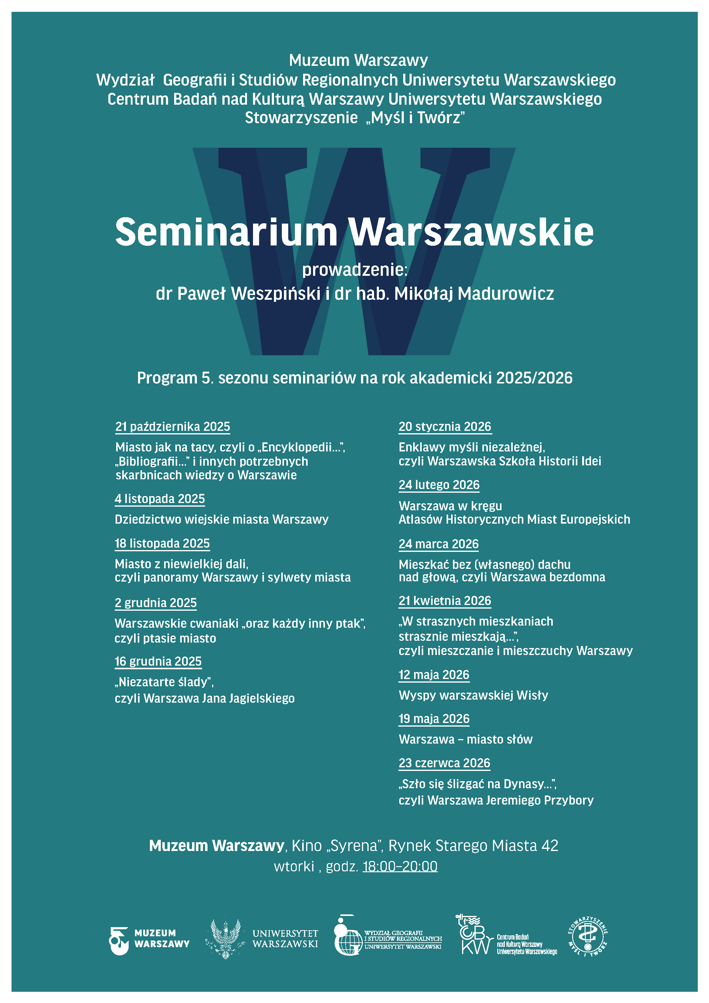Seminaria odbywają się w wybrane wtorki w godz. 18.00-20.00 w Sali Kinowej Muzeum Warszawy (Rynek Starego Miasta 42, parter, wejście przez drewnianą bramę od ulicy Nowomiejskiej).