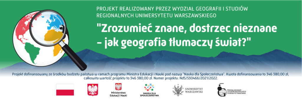 Projekt pt.: „Zrozumieć znane, dostrzec nieznane – jak geografia tłumaczy świat?„, realizowany jest przez Wydział Geografii i Studiów Regionalnych Uniwersytetu Warszawskiego w ramach programu MEiN pt. „Nauka dla Społeczeństwa”.